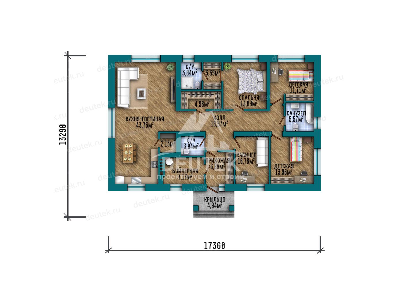 Габариты дома: 17.36 x 13.29 м