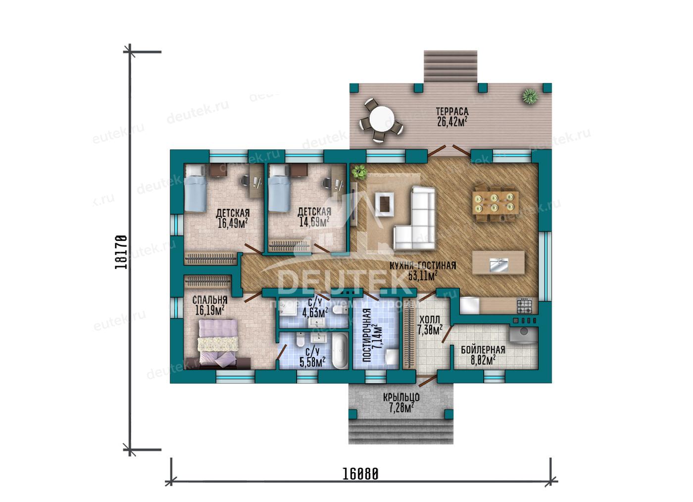 Проект загородного одноэтажного дома с размерами 16 м на 18 м - LK-372