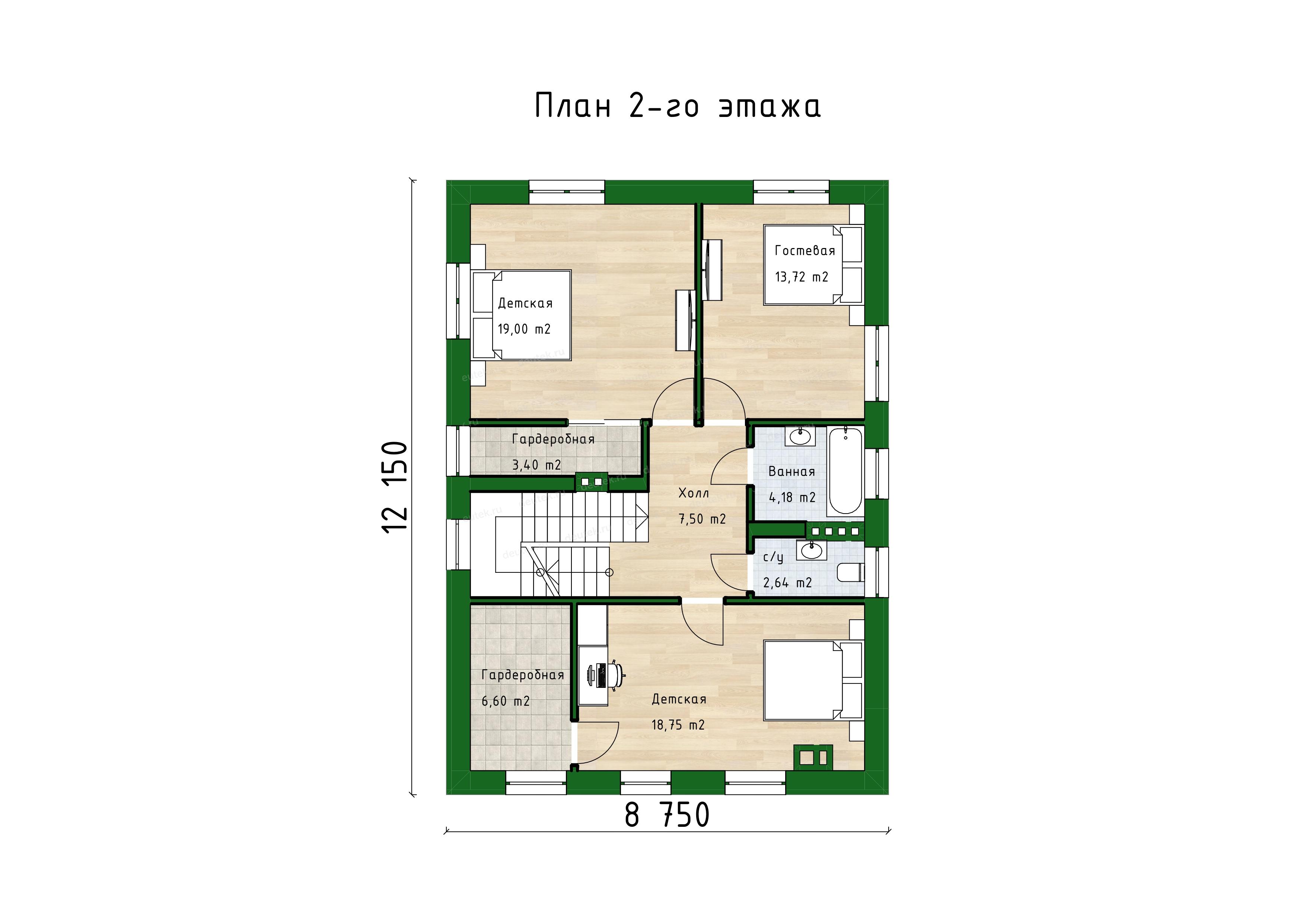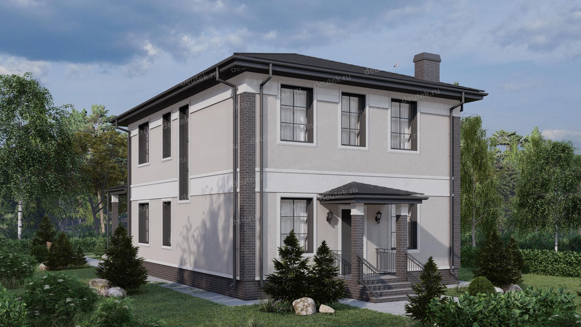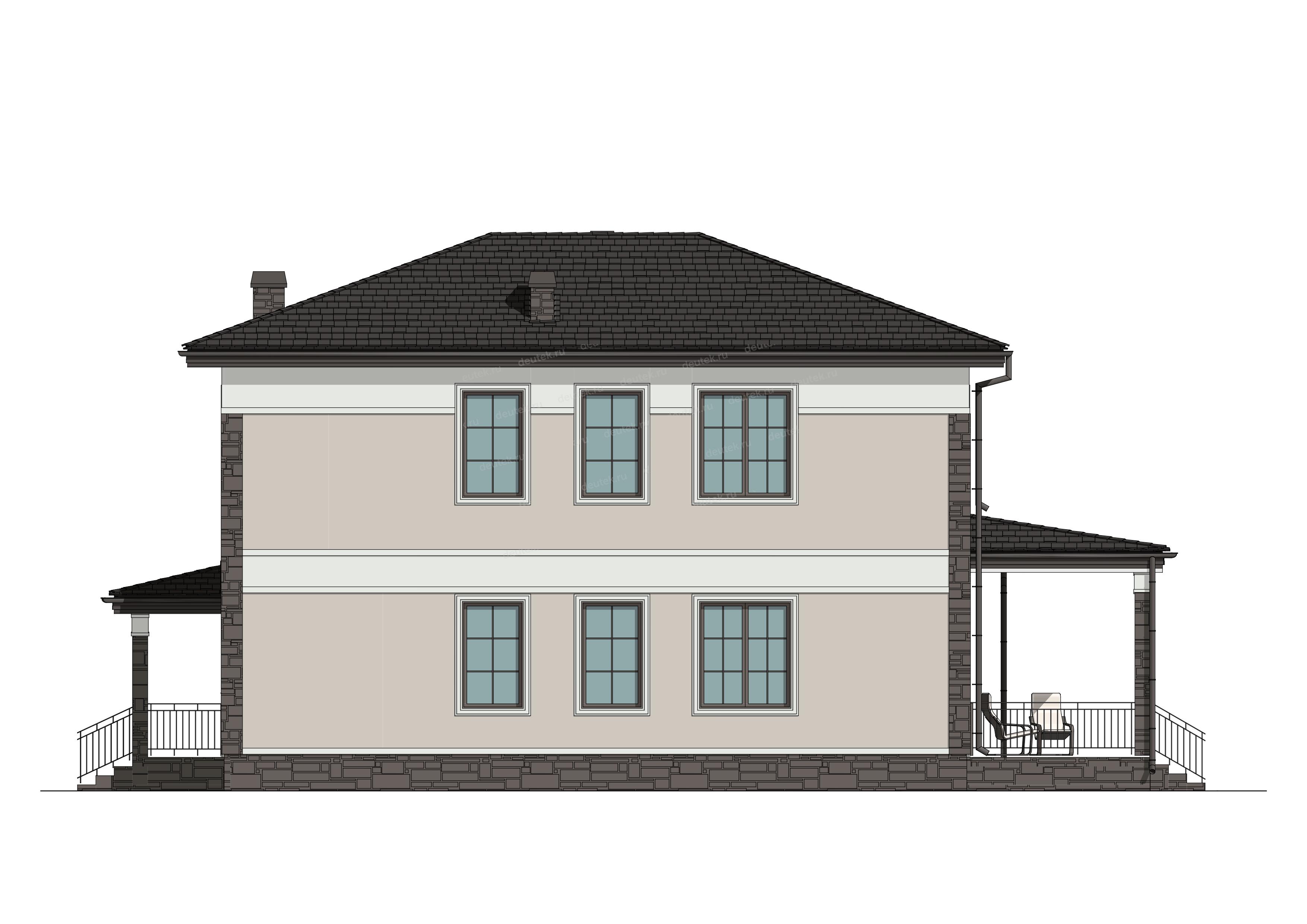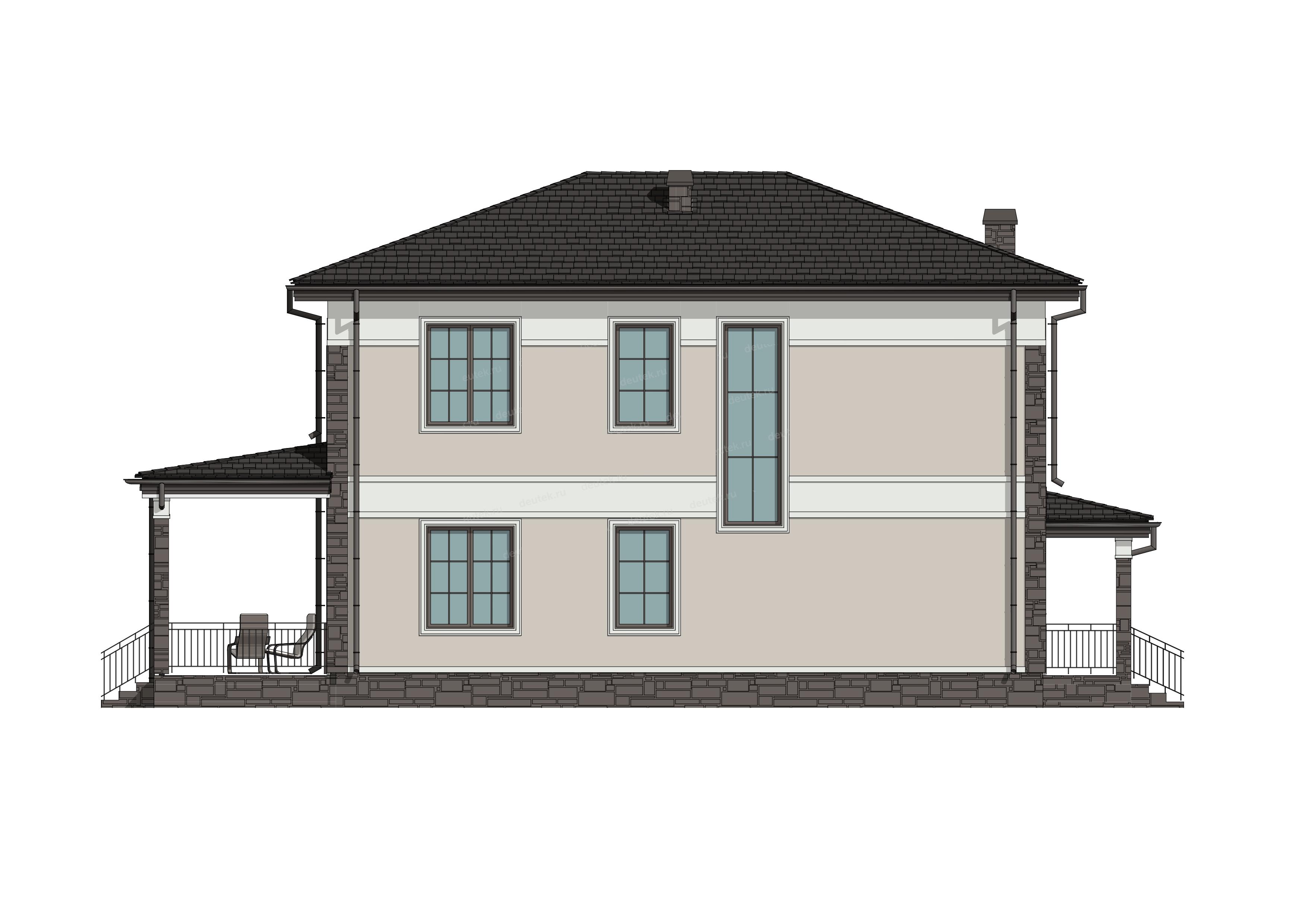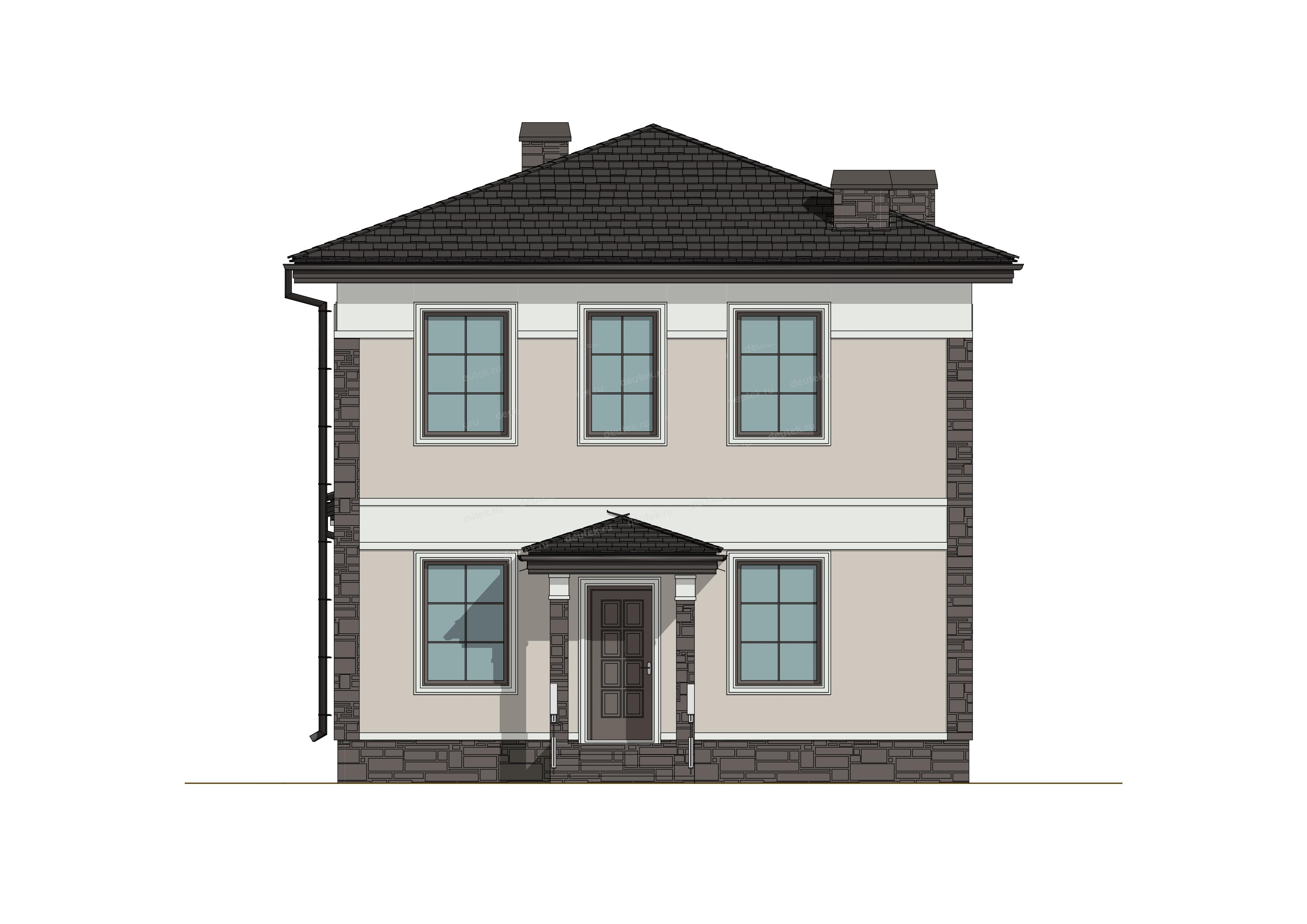 Фасад: | фасадная штукатурка с декоративным обрамлением углов рустами; цоколь: декоративный камень |