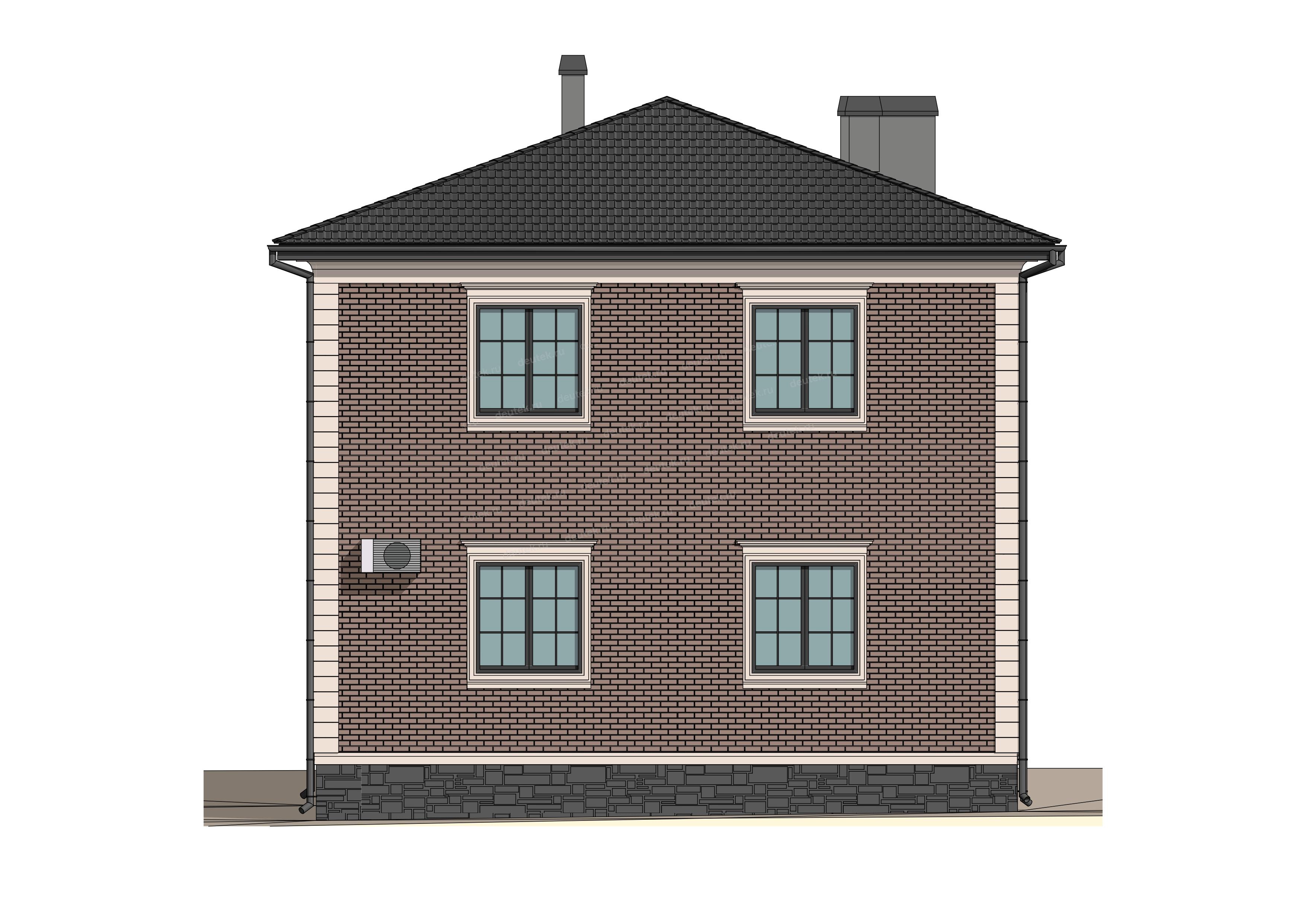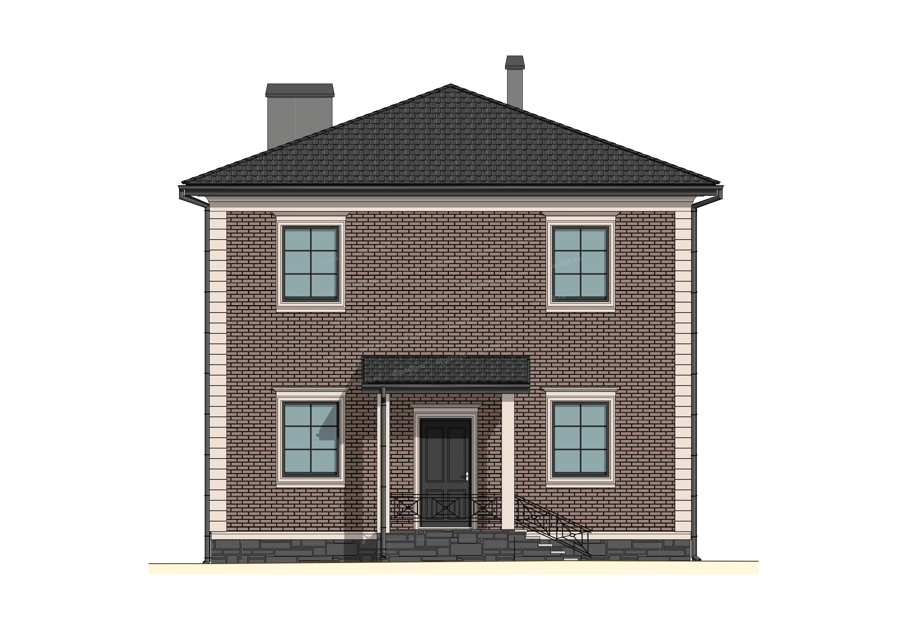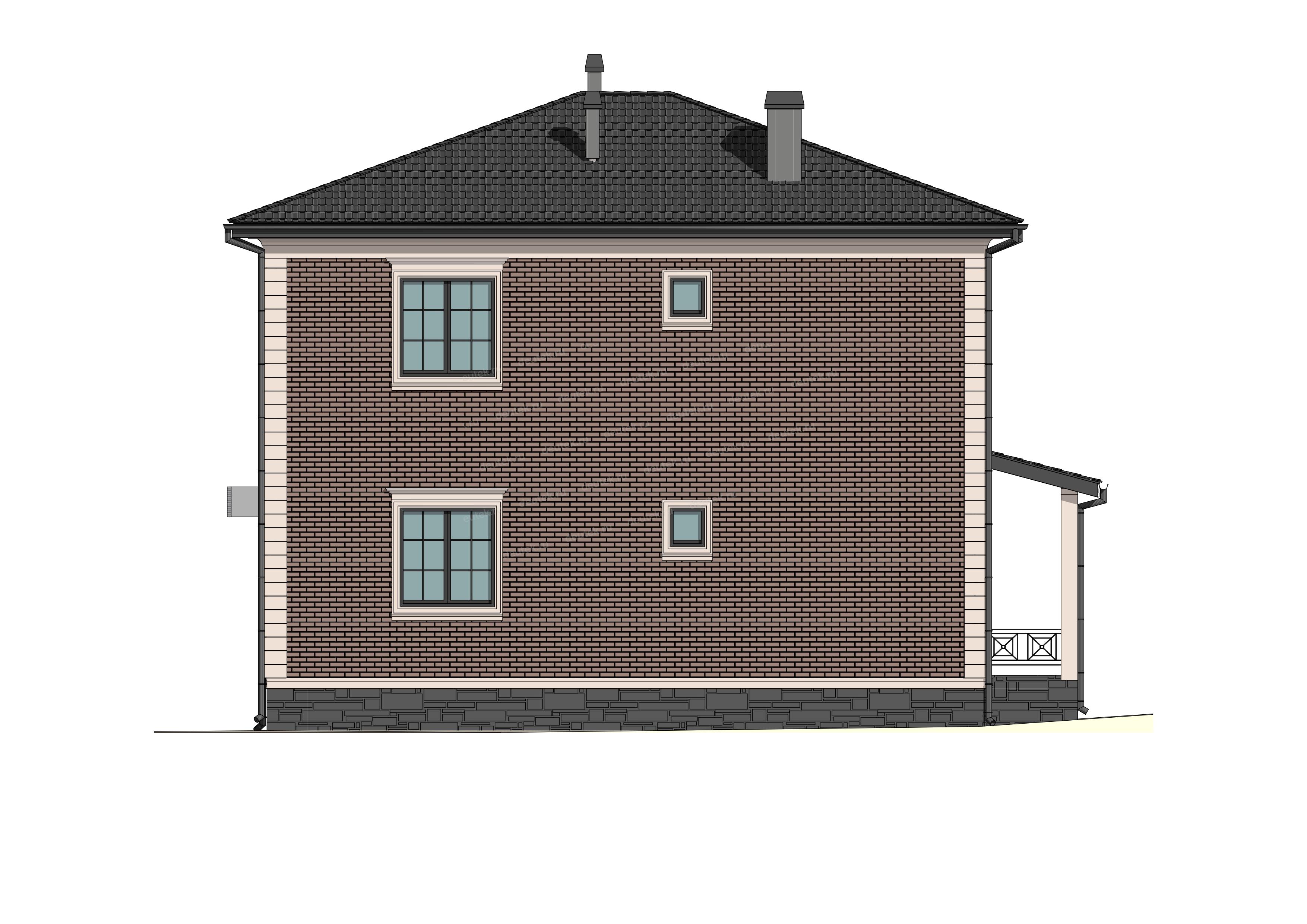 Фасад: | наружная отделка - облицовочный кирпич с декоративным обрамлением углов и окон молдингом, цоколь - декоративный камень |