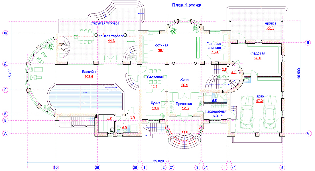 Большая часть наших проектов содержит монолитную плиту, которая является универсальным фундаментом и подходит под большинство типов грунта. Буронабивные сваи с монолитной лентой ростверка являются самым доступным решением, но чтобы реализовать это решение необходимо предоставить отчет геологии, который вы можете заказать у нас или в любой другой компании. Данный тип фундамента иногда не может быть применен к слишком большим и тяжелым домам. Экономия, по сравнению с плитой, достигает до 40%.